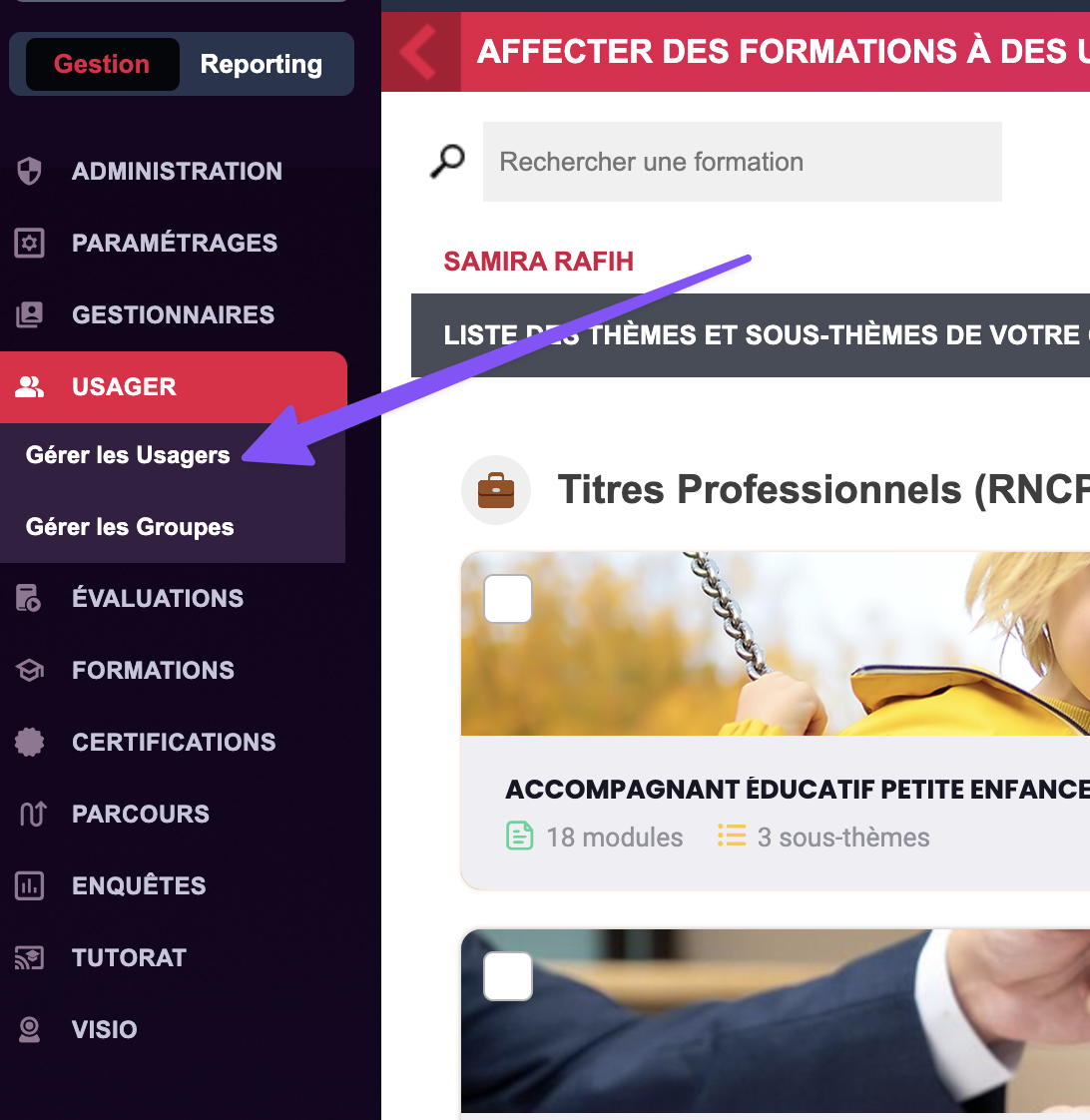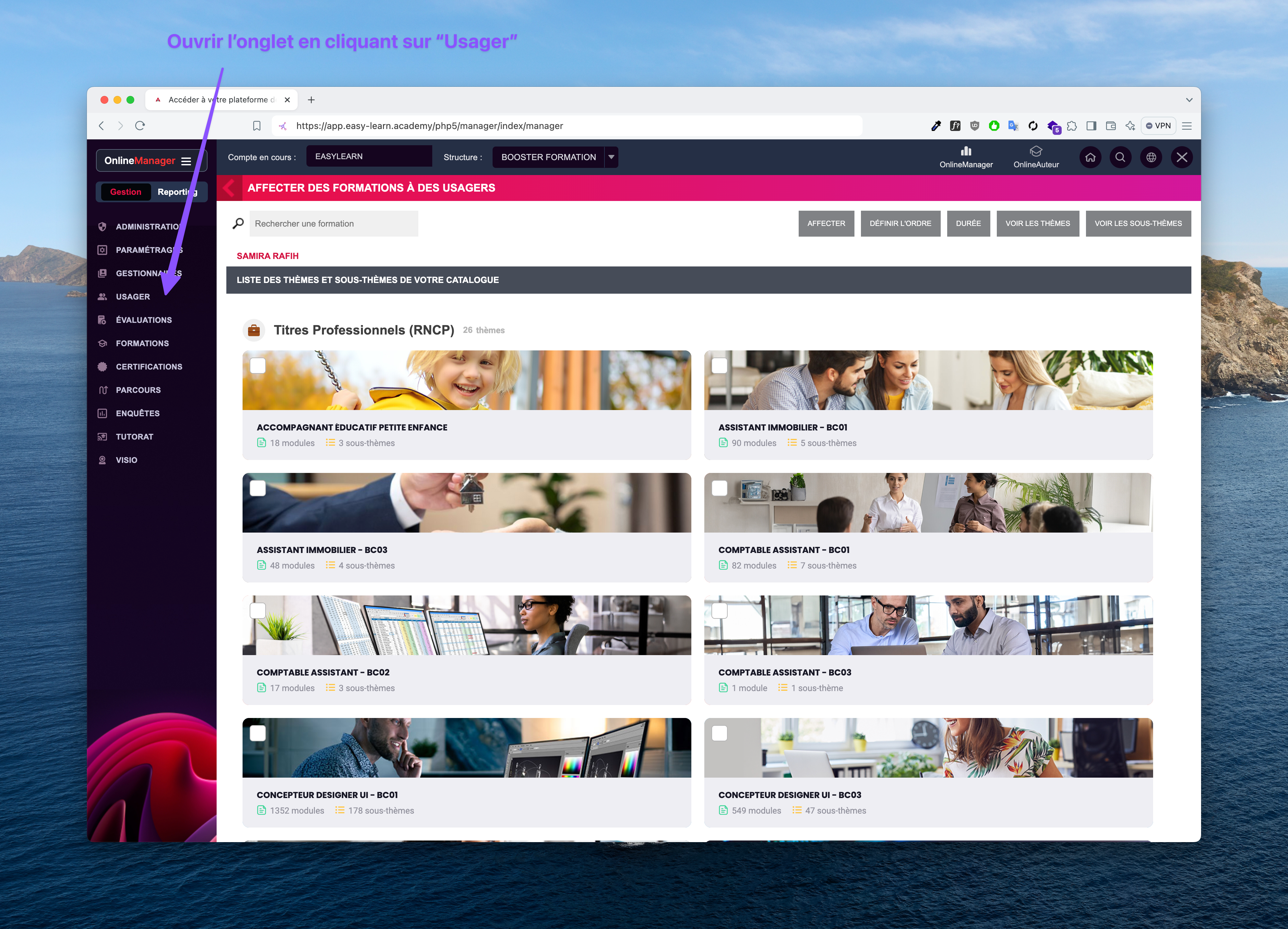 Pour ajouter un Usager il vous suffit, de vous connecter sur votre plateforme LMS mis à votre disposition via le lien : [https://app.easy-learn.academy/](https://app.easy-learn.academy). Une fois connecté rendez-vous dans la section à gauche : "Usager"