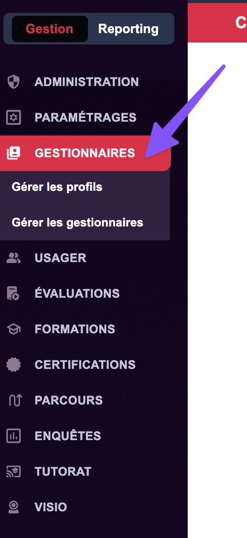 Pour ajouter un gestionnaire (une personne ayant tous les droits d'administration de votre LMS), il vous suffit de faire exactement la même procédure. Au lieu de cliquer sur "Usager" rendez-vous dans la rubrique "Gestionnaire". Puis une fois le menu déplier cliquer sur "gérer les gestionnaires". Vous pourrez alors créer le gestionnaire en configurant son compte préalablement avec certaine règle.